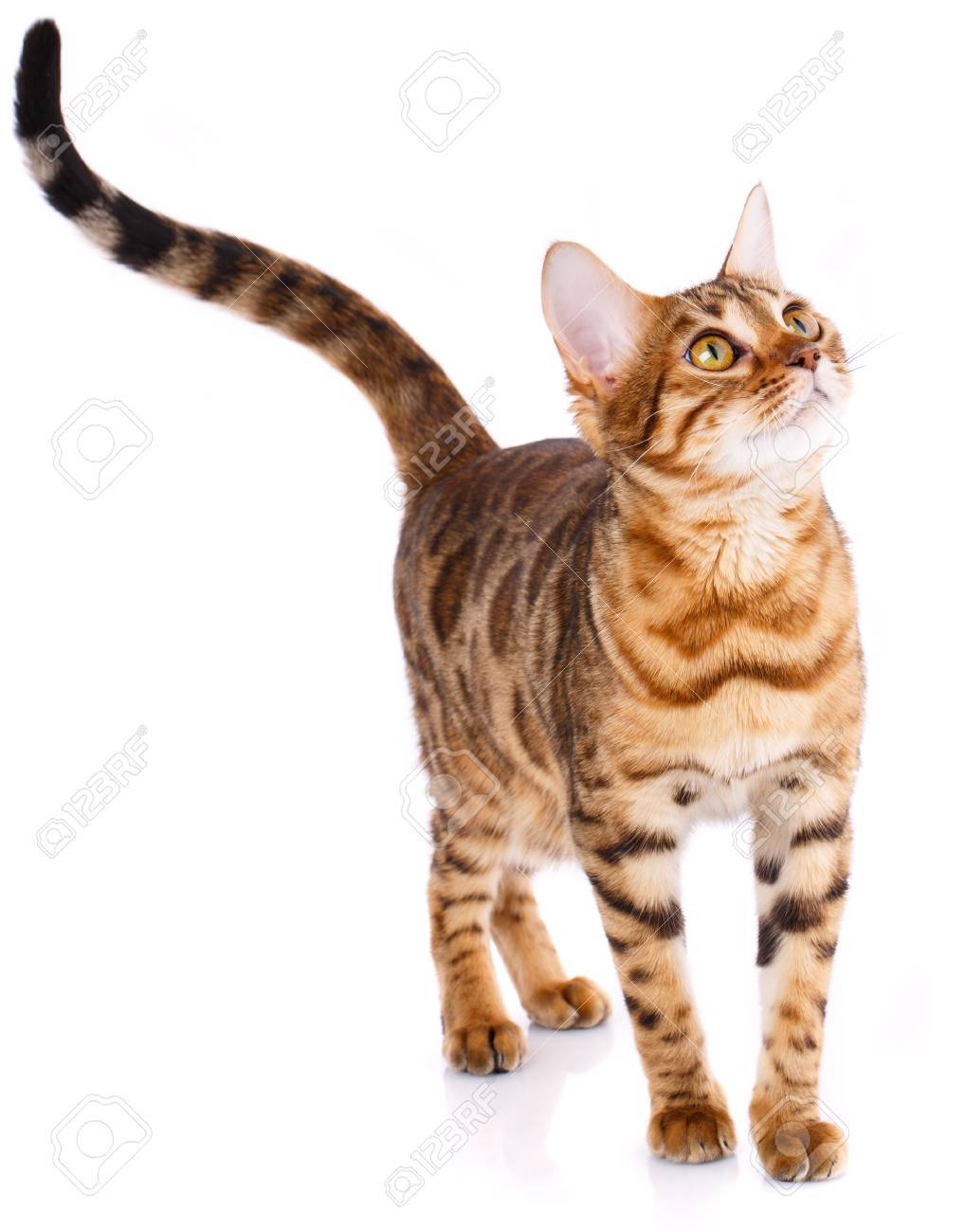 Playful Bengal Cat Looking Up Pets Animals And Cats Concept