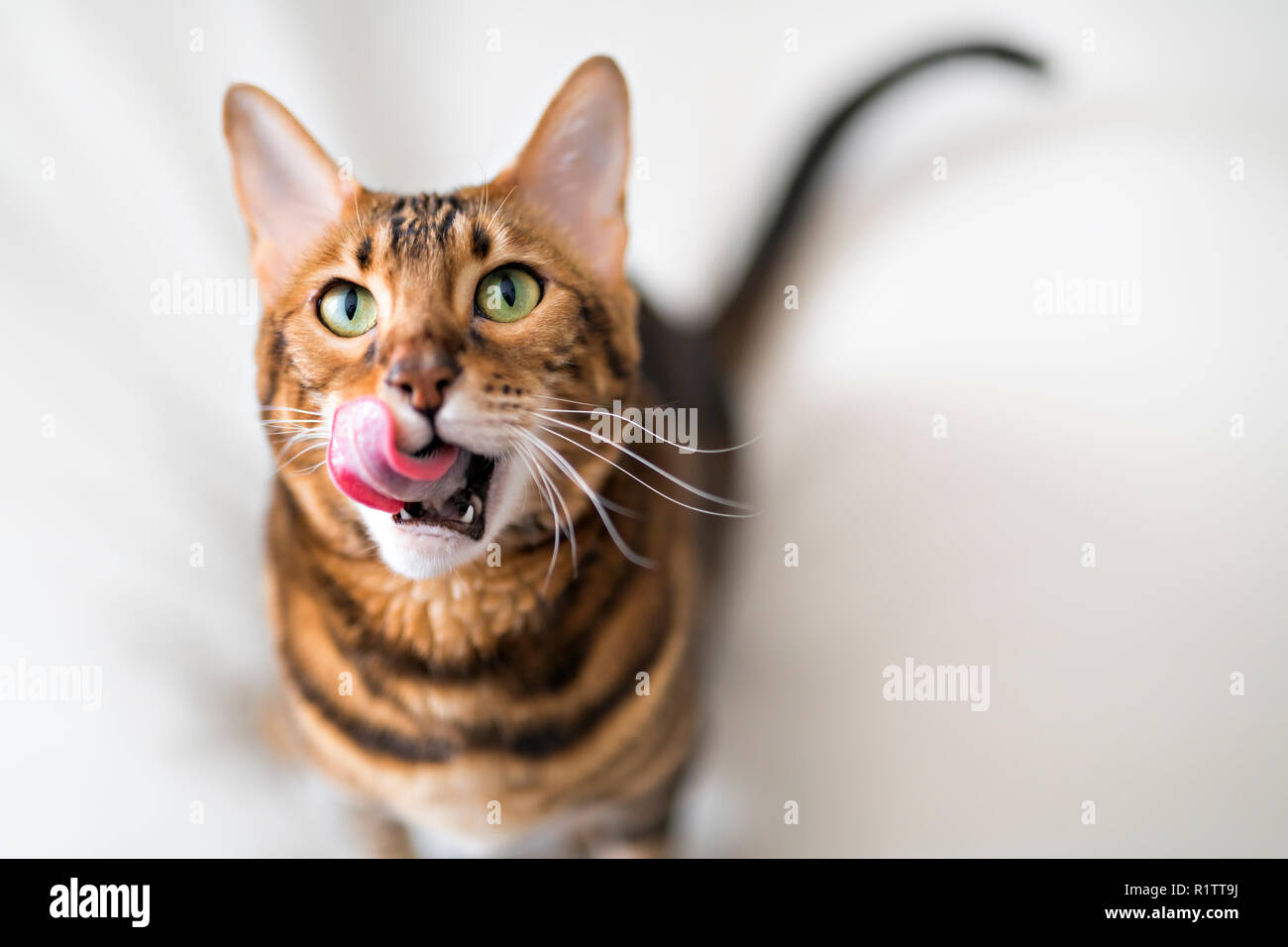Bengal Cat Looking Over The Table With Green Eyes Stock