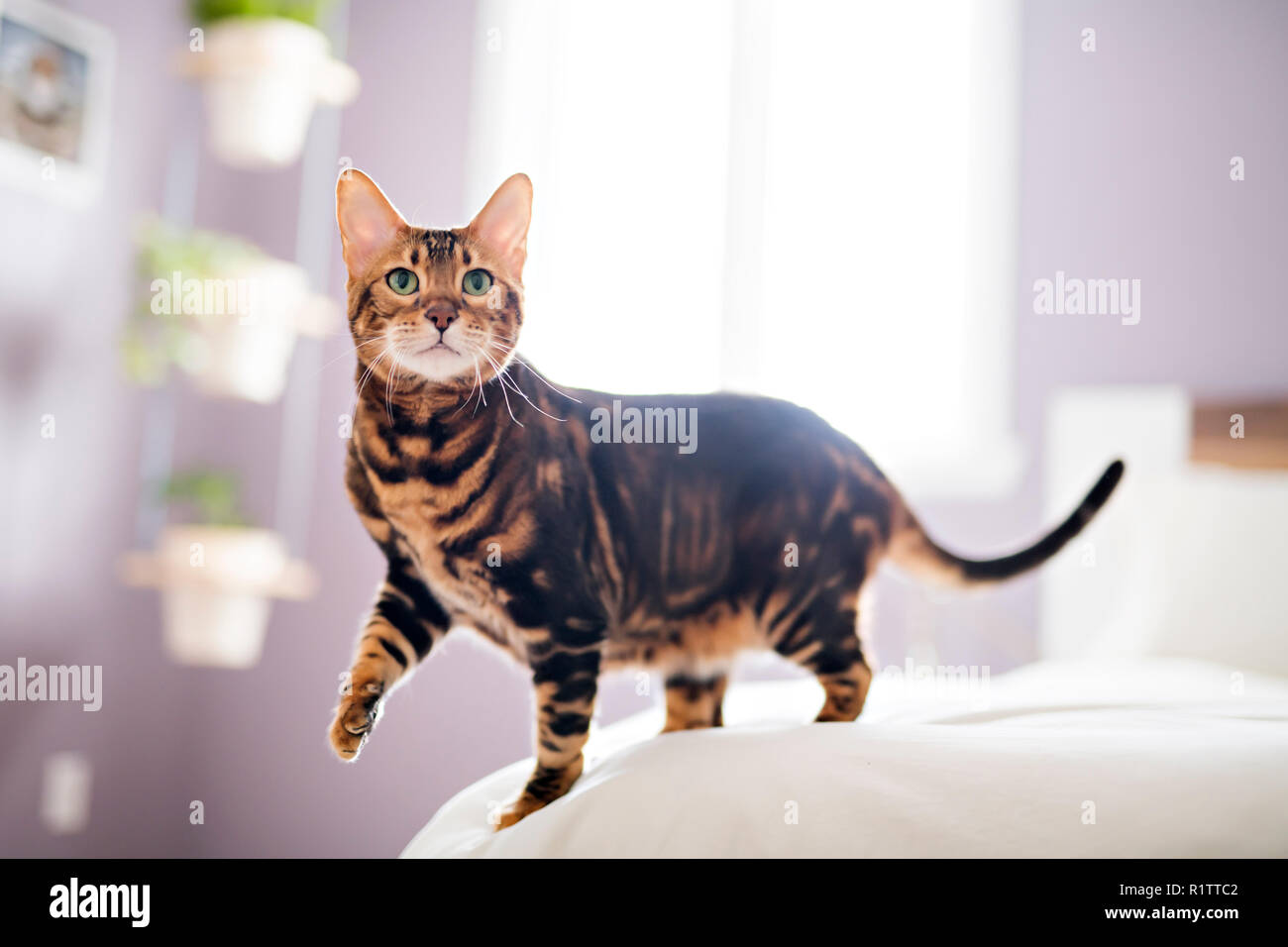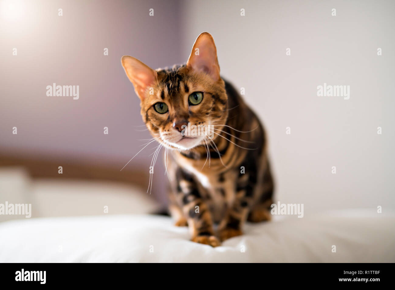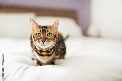 Bengal Cat With Green Eyes In The Bedroom Stock Photo