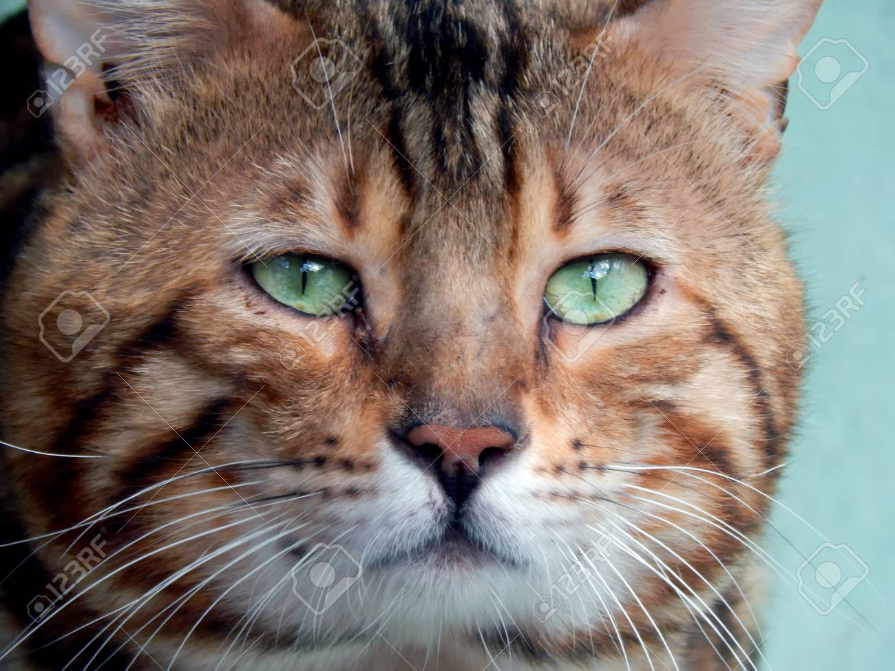 Closeup Portrait Of Bengal Cat With Green Eyes Stock Photo
