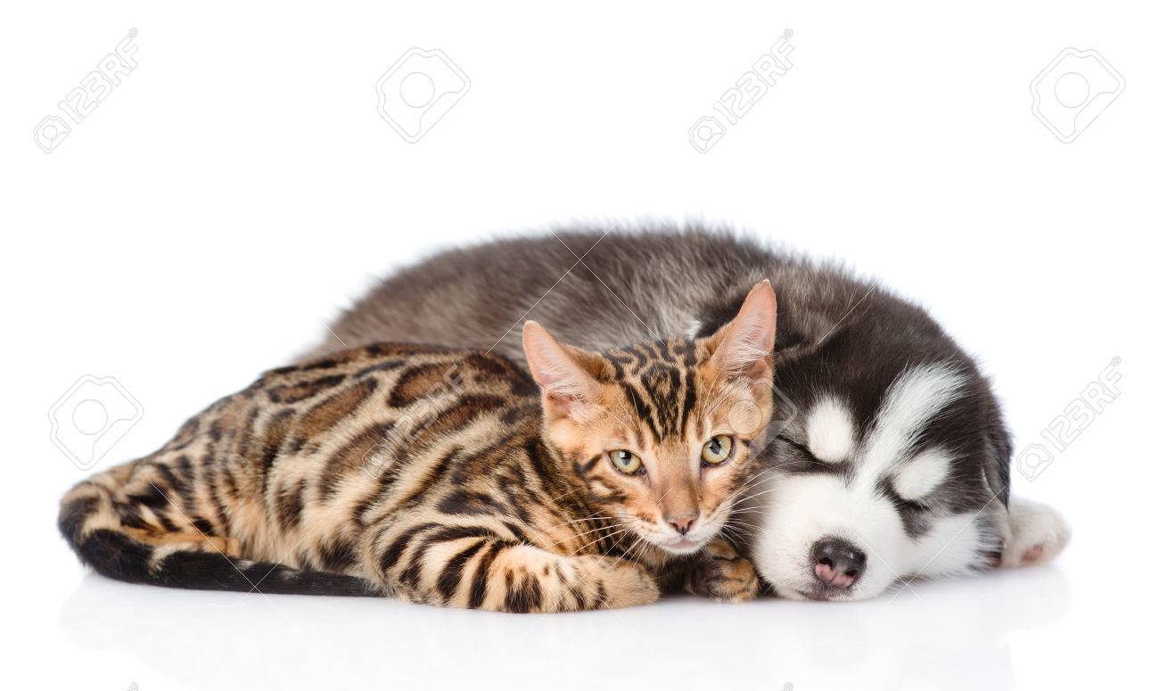 Sleeping Siberian Husky Puppy Embracing Bengal Cat Isolated