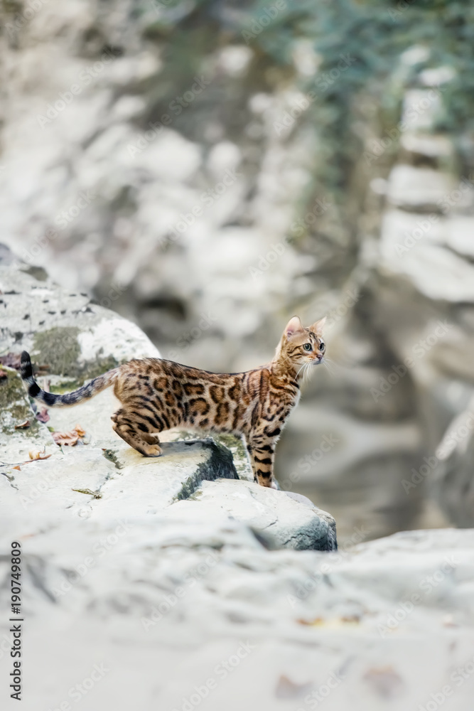 Bengal Cat Walking In Nature Outdoor With Bright Sunlight