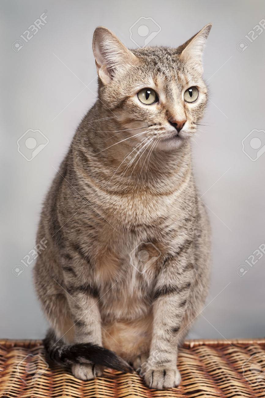 Portrait Of One Obese Black And Brown Bengal Cat With Yellow