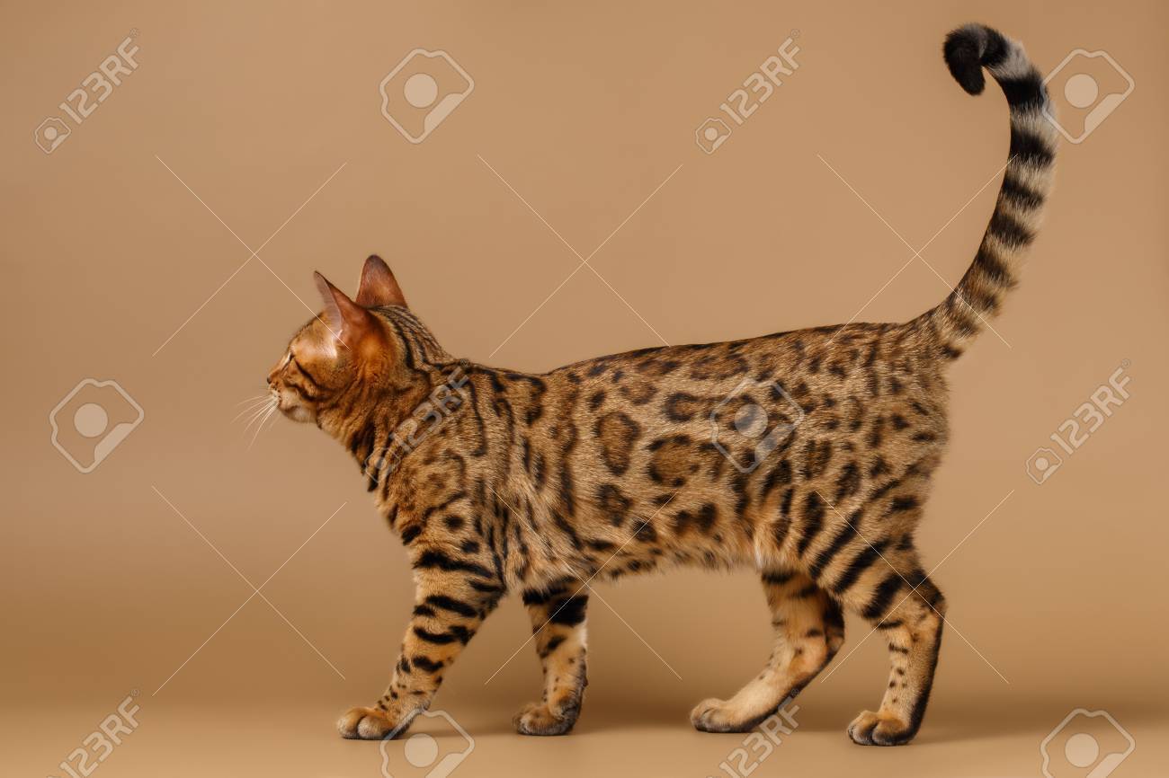 Beautiful Bengal Cat Stands On Brown Background