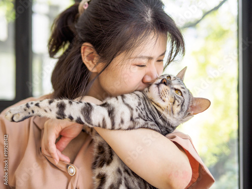 Portrait Of A Beautiful Young Chinese Girl Hold A Bengal Cat