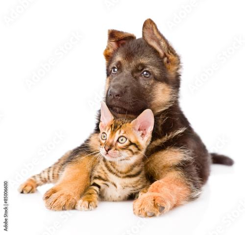 German Shepherd Puppy Dog Embracing Little Bengal Cat