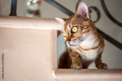 Close Up Portrait Of Bengal Cat Looking Down From Staircase