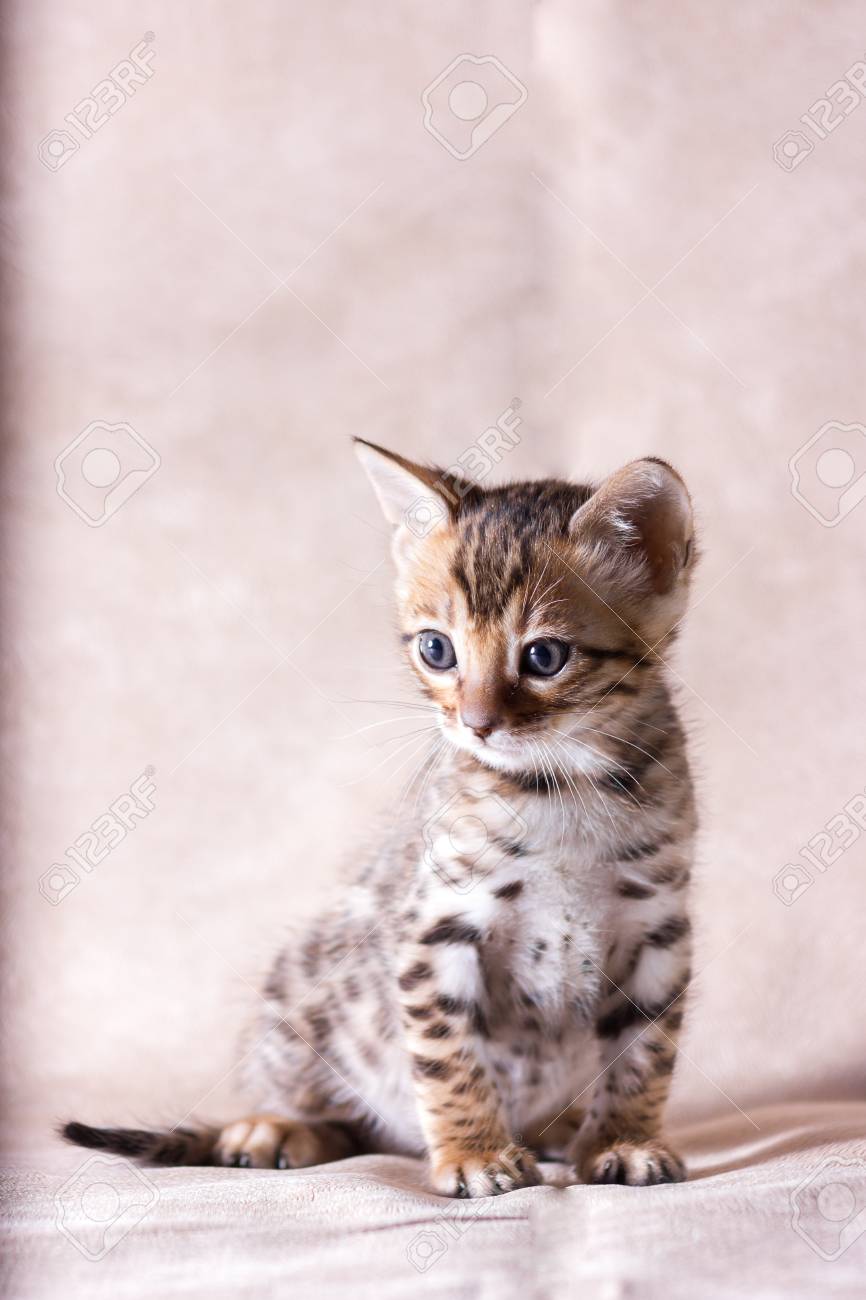 Graceful Leopard Bengal Kitten Indoor On Beige Fabric Background