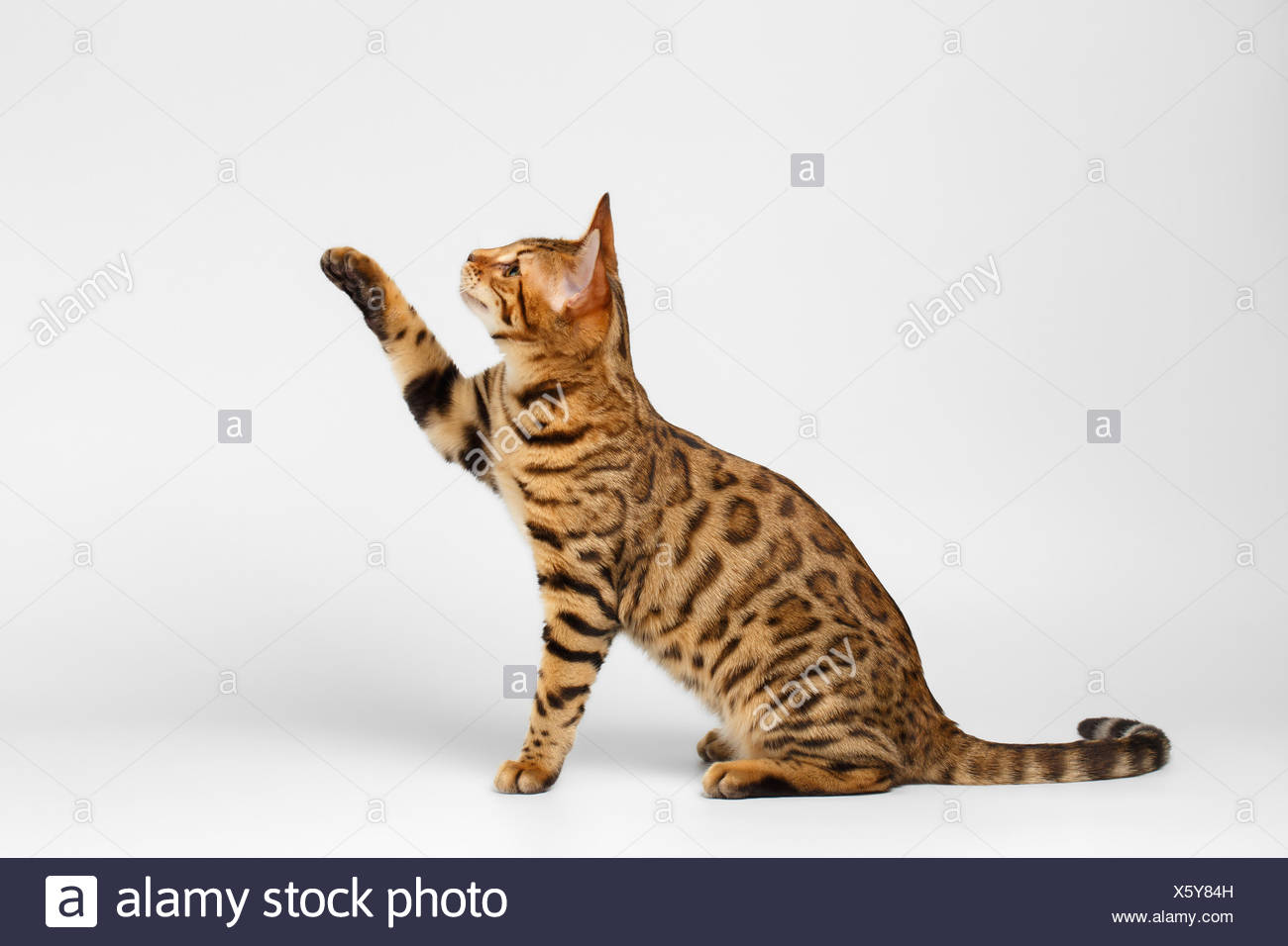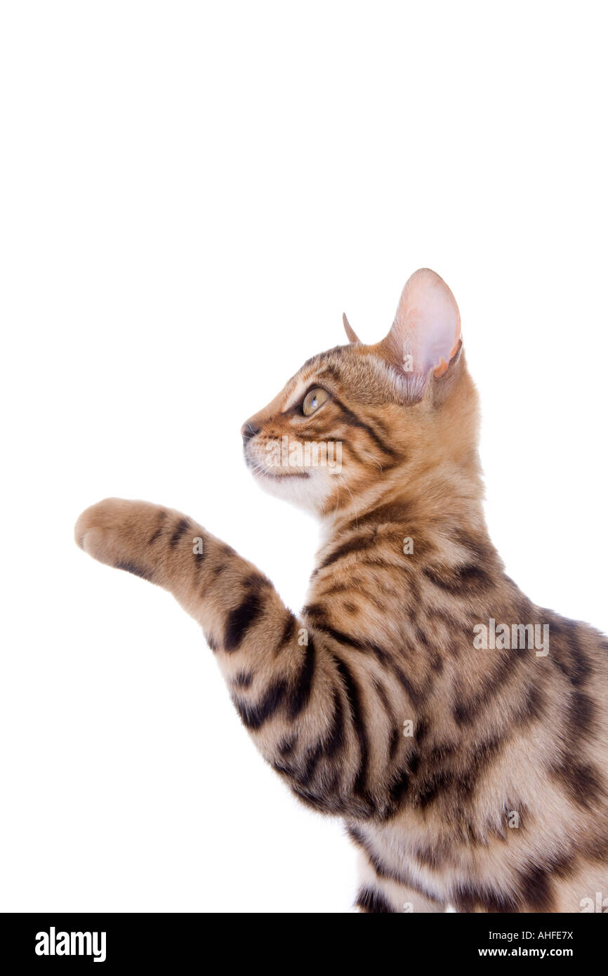 Bengal Cat Raising Up Paw On White Background Stock Photo