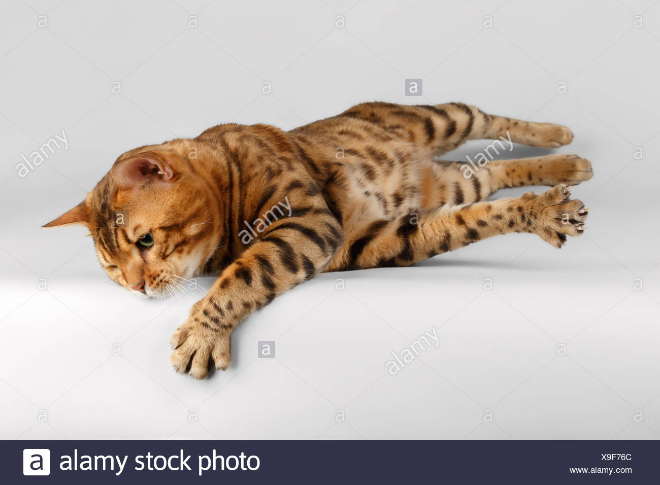 Bengal Cat Lies On White And Raising Paw Stock Photo