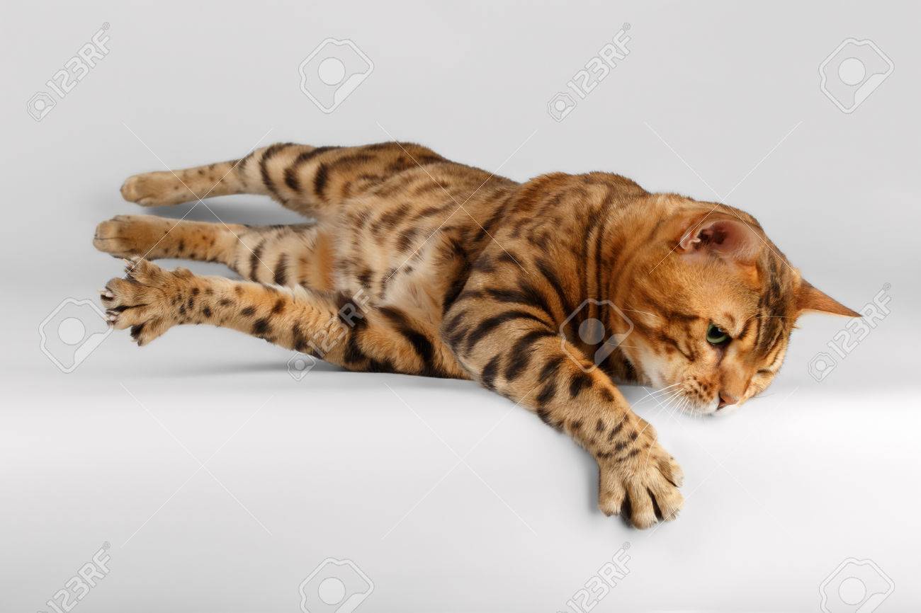 Adorable Bengal Male Cat With White Fur Lying And Raising Paws