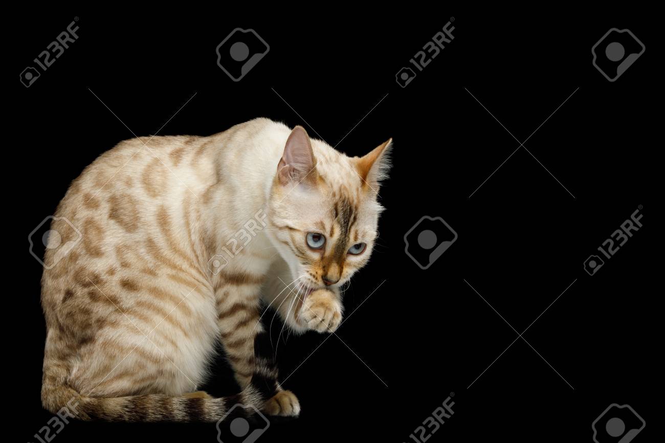 Washes Snow White Bengal Cat With Rosette Fur Sitting And Licking