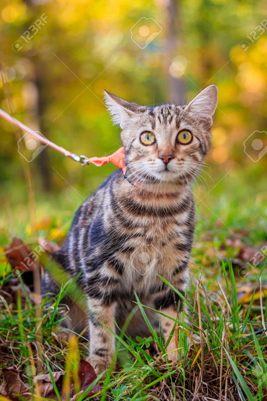 Domestic Cat For A Walk In The Autumn Park Home Pet Cat
