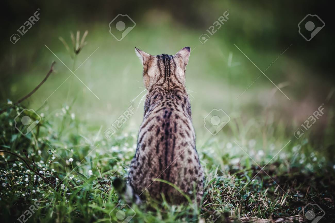 Back View Pretty Bengal Cat Sitting On Green Grass And Looking